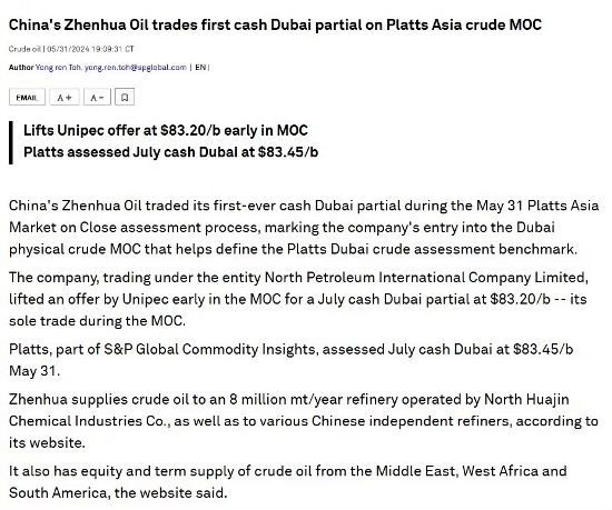 On May 31, ZhenHua Oil successfully completed its first Platts Window trade, and entered the top-tier global crude oil trading platform. This marks a significant step towards upgrading and transforming the company's crude oil trading business and participating in the pricing of Middle East crude oil. Simultaneously, this transaction has successfully opened a new sales channel for the company's UAE long-term contract resources and laid the groundwork for the upcoming spot procurement for the Huajin mega-project.
